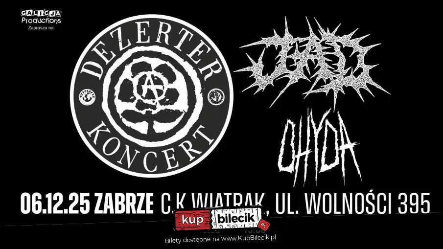 | Dezerter, Jad, Ohydadodano 2025-09-09 11:15:15 Dezerter to zespół punkrockowy, który powstał w Warszawie w maju 1981 r. Grupa przyjęła prowokacyjną wówczas nazwę SS-20 (pochodzącą od radzieckich rakiet z głowicami nuklearnymi), którą była zmuszona zmienić w okresie stanu wojennego. Już jako Dezerter zespół nagrał singiel "Ku przyszłości" (1983). W 1985 r. ukazały się dwie kompilacje z piosenkami Dezertera: "Fala" i "Jak punk to punk". Rok 1987 przyniósł wydanie w USA przez Maximum Rock"n"Roll pierwszej długogrającej płyty Dezertera "Underground Out Of Poland" oraz pierwszej (ocenzurowanej) płyty w kraju - "Kolaboracja". Rok 1989 to kolejny album - "Kolaboracja II", a 1990 - "Wszyscy przeciwko wszystkim" (wydana w Polsce i we Francji) oraz dwumiesięczna trasa po Europie Zachodniej (Szwajcaria, Niemcy, Francja, Holandia) i Japonii. Zespół aktywnie koncertuje nie tylko kraju, ale również w wielu krajach Europy (Czechy, Niemcy, Wielka Brytania, Finlandia) oraz w Stanach Zjednoczonych. Piosenki Dezertera znalazły się na wielu składankach oraz trafiły na ścieżki dźwiękowe kilku filmów (m.in. "Wałęsa. Człowiek z nadziei" w reż. A. Wajdy oraz "Dom zły" w reż. W. Smarzowskiego). Dezerter to: Dezerter artyści: Robert "Robal" Matera, Krzysztof Grabowski, Jacek ChrzanowskiDezerter to zespół punkrockowy, który powstał w Warszawie w maju 1981 r. Grupa przyjęła prowokacyjną wówczas nazwę SS-20 (pochodzącą od radzieckich rakiet z głowicami nuklearnymi), którą była zmuszona zmienić w okresie stanu wojennego. Już jako Dezerter zespół nagrał singiel "Ku przyszłości" (1983). W 1985 r. ukazały się dwie kompilacje z piosenkami Dezertera: "Fala" i "Jak punk to punk". Rok 1987 przyniósł wydanie w USA przez Maximum Rock"n"Roll pierwszej długogrającej płyty Dezertera "Underground Out Of Poland" oraz pierwszej (ocenzurowanej) płyty w kraju - "Kolaboracja". Rok 1989 to kolejny album - "Kolaboracja II", a 1990 - "Wszyscy przeciwko wszystkim" (wydana w Polsce i we Francji) oraz dwumiesięczna trasa po Europie Zachodniej (Szwajcaria, Niemcy, Francja, Holandia) i Japonii. Bilety do nabycia na: KupBilecik.pl |